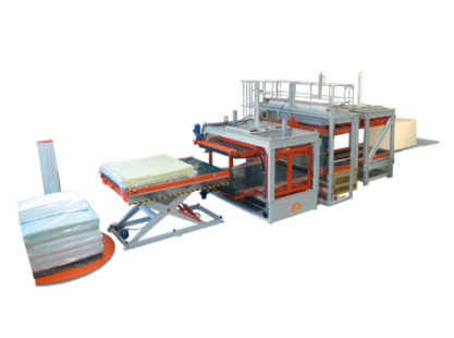 Packing line to reduce mattress volume by compression before wrap with PE film and roll up mattress